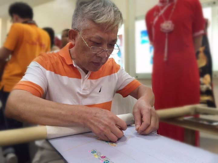 汉绣针法藏巧于拙,虽然简洁但很丰富,朴素却不繁杂,讲究的是“一画二绣三收拾”。姜成国作为汉绣市级传承人,正在进行衣领的刺绣。