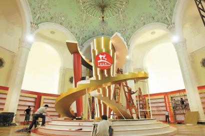 接近17时布展清场时间,忙碌一天的工作人员从各岗位撤离,等待次日清晨再入场冲刺。在贵州展区布展的几个女孩,这才有时间好好看一眼主会场的建筑细节。“那边的穹顶真漂亮!”顺着手指方向望去,序馆浅绿色布满美丽花纹的穹顶下,今年书展主造型已经树起,金色立柱旁是盘旋而上的阶梯。很快,这里又将成为读者们争相留下每年书展记忆的“书香地标”。