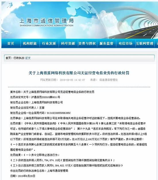 关于上海倍质网络科技有限公司无证经营电信业务的行政处罚