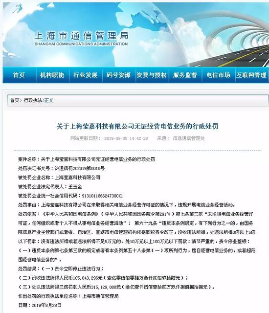 原标题:上海通信管理局处罚两无证经营电信业务企业:单笔罚没超4亿