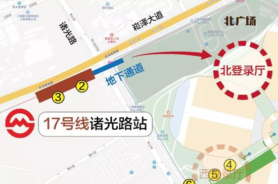 观众到达诸光路站后,通过过街地道直通场馆北广场,从北登录厅入场。
