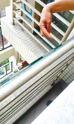 记者立即跟随张先生前往事发阳台正上方查看,5楼阳台果然是被锁上的,5楼和8楼阳台的延伸长度都比2楼短了约两米,护栏是由数根金属横杠和高约一米的玻璃组成。