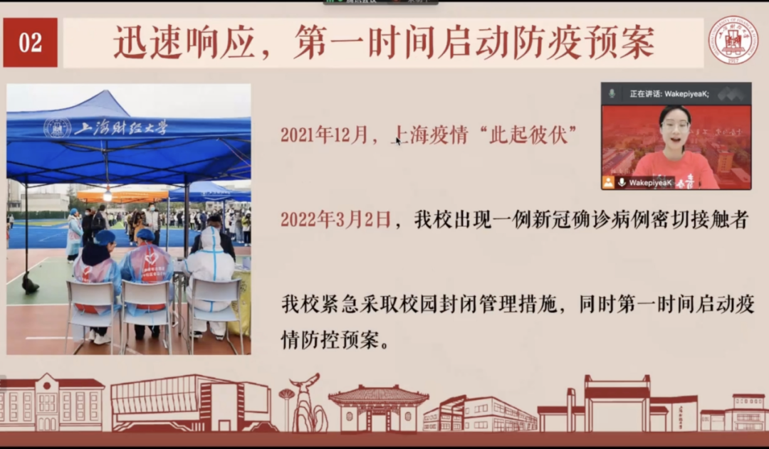周雨梦:听到各位老师与同学分享了自己的抗疫经历,让我十分感动。身边有老师虽然家里还有事情,也都义无反顾地参与学校的抗疫工作,兼顾好教学、科研与防疫工作。还有认识的同学也是,都十分积极地报名参与到防疫工作中,有些同学主动担任核酸志愿者,打包好东西住进体育馆,虽然自身的课业繁重,却把集体的利益放在首位。正是老师与同学们的齐心协力、团结一致,让我们的封控生活更加有序,十分感谢他们辛勤的无私奉献。