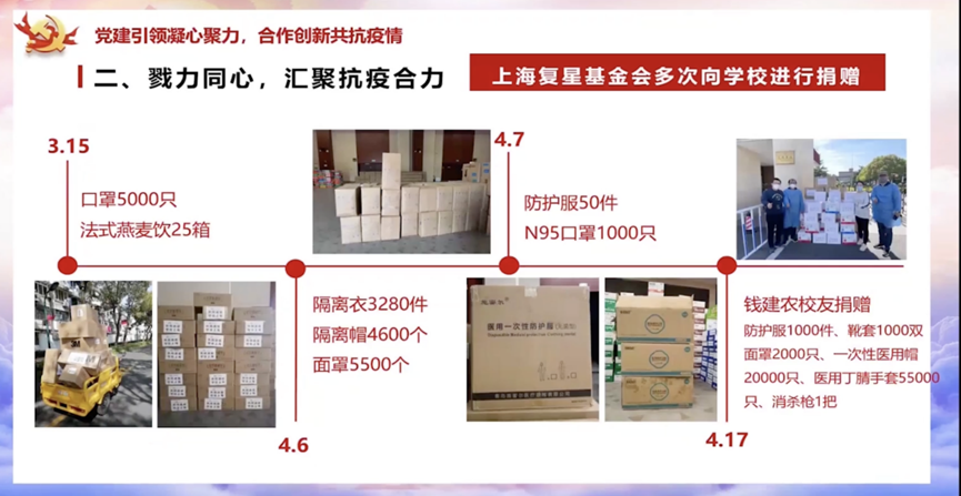 学校进入封控管理以来,机关第十五党支部在支部书记陈红梅老师的带领下,成立了由党员为主体的“抗疫捐赠先锋队”,以党建引领,立足合作发展工作,积极创新工作模式,汇聚校友、校董以及社会各界的力量,全方位助力学校疫情防控。同时。机关第十五支部还依托校友校董协同育人平台,发挥校友导师作用,举办丰富的线上系列活动,关心在校生疫情期间的学习和生活。