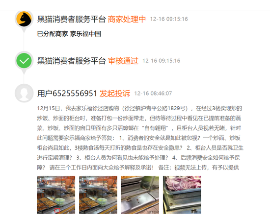 [网友投诉:家乐福徐泾店3楼熟食柜台 蟑螂丛生店员视若无睹]网友投诉称,12月15日在家乐福徐泾店3楼卖熟食柜台处,准备打包一份炒面带走。但在等待炒面的过程中,看见放食物的窗口里有多只活蟑螂,且柜台人员视若无睹。针对此问题,网友需要家乐福商家给予解释及承诺!截至12月16日14时,@家乐福中国 尚未在黑猫平台作出回应。后续进展,我们将持续关注。投诉详情:https://sh.tousu.sina.com.cn/complaint/view/17348266859/ 黑猫投诉上海站,守护上海人的消费权益,本地投诉入口链接:http://t.cn/EJajEkl