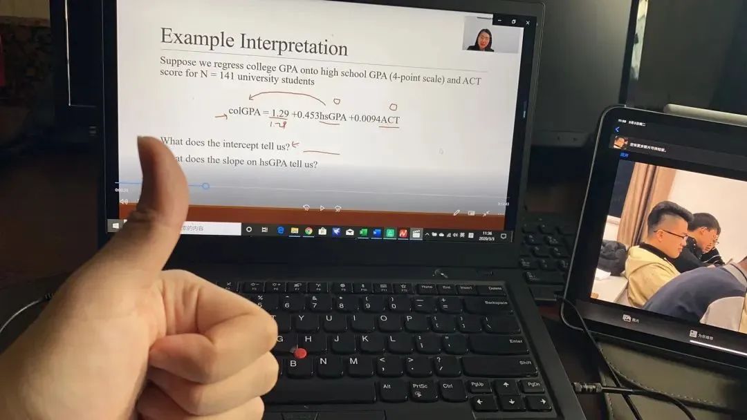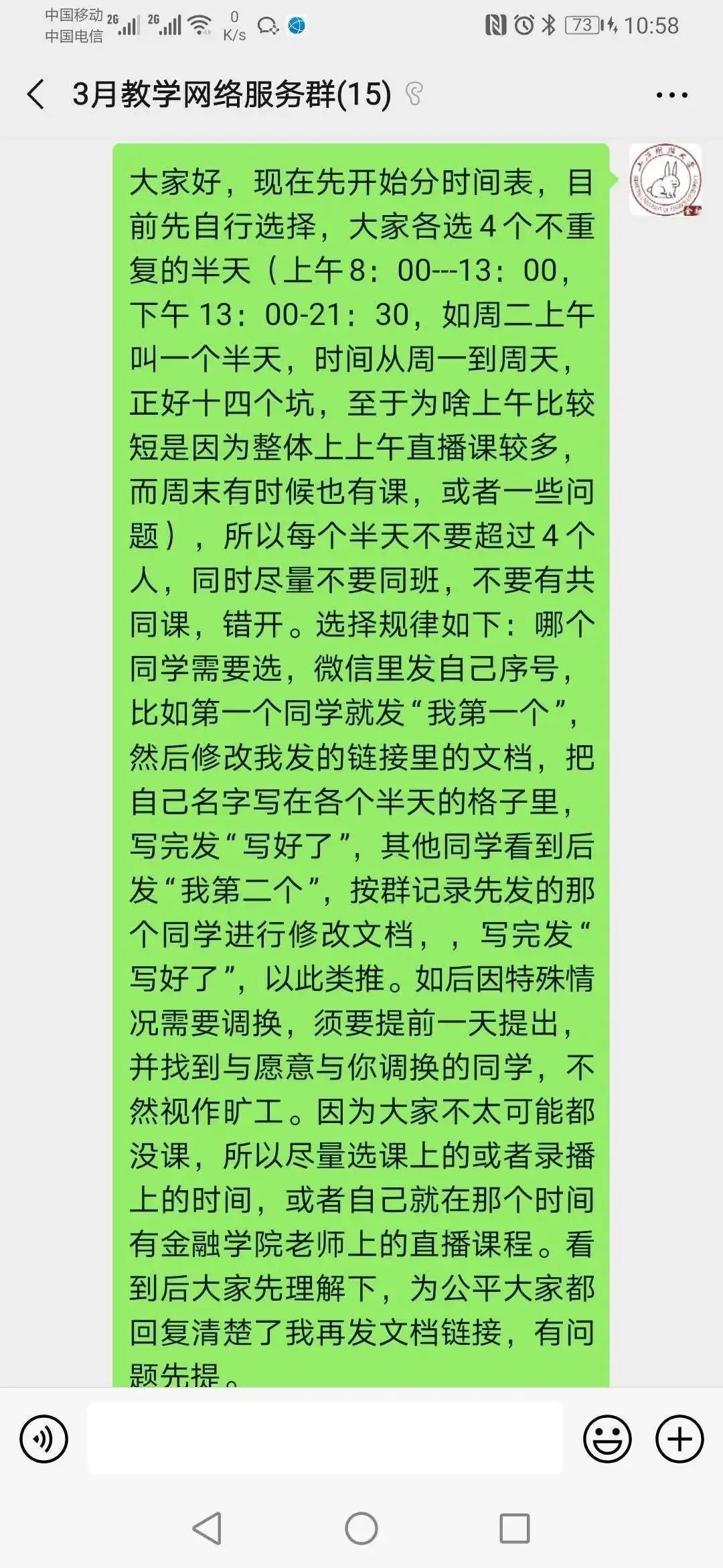 19级金融工程与量化投资的项宇博同学则表示,网课展示畅通,声音、课件、图片等能够及时送达,没有卡顿现象,效果很好。同学们纷纷表示作为上海财经大学的一名普通研究生,大家会积极配合老师进行线上教学,在增强专业素养的基础上,增强自己的科学人文素养,期待在春暖花开时,都健健康康地回到学校。