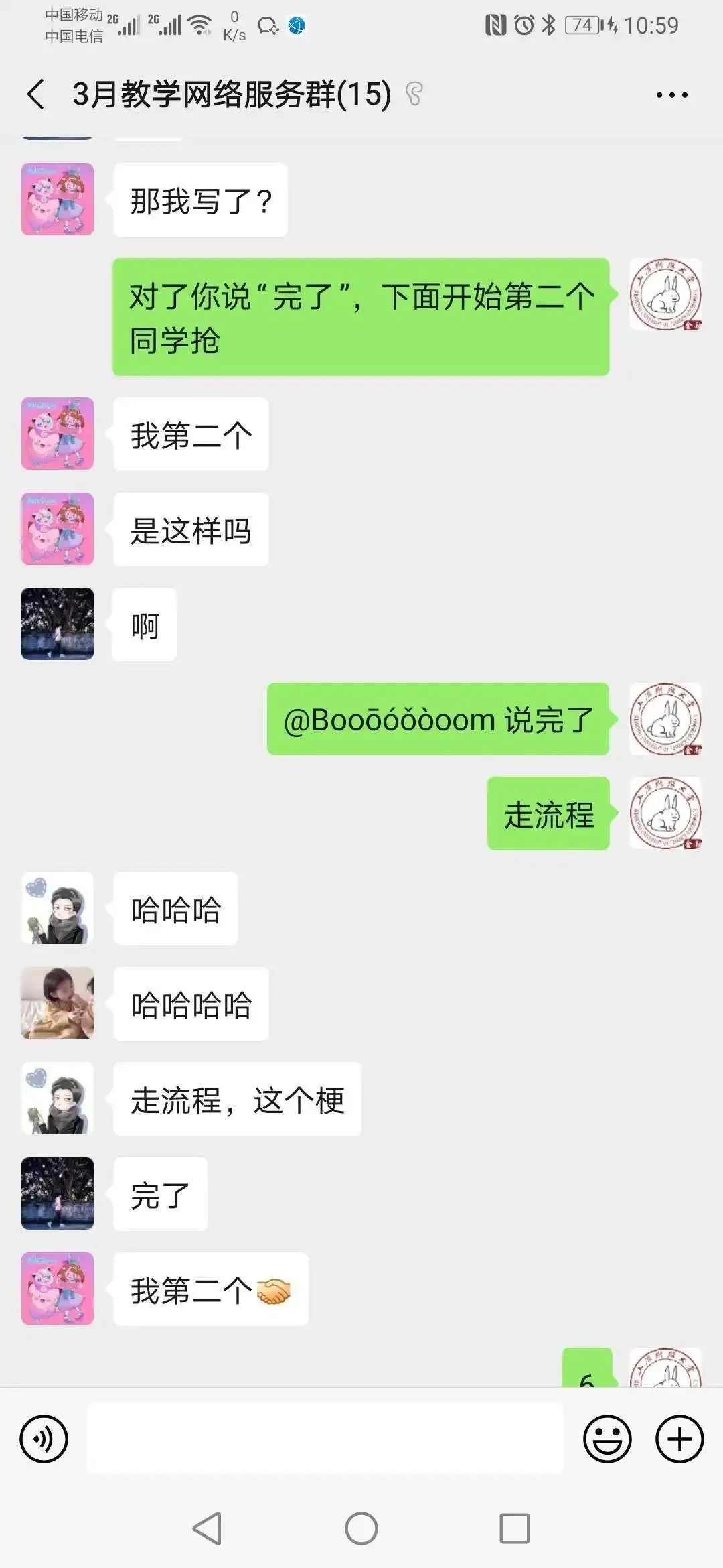 线上教学在师生努力下稳步推进,这与教务组和服务组的连夜奋战密不可分。开课之前,教务组多次zoom线上会议共同讨论线上授课方案,并负责和学院老师沟通确认开展线上教学的形式以及开课时间。学院本、研教务秘书深入学生班长群和学习委员群,直接在一线现场回答和解决学生关于课程的一系列问题和咨询,每天的咨询量都在上百人次。同时,他们与每一位老师对接,统计老师的授课形式,提醒并辅助老师进行线上教学测验,确保每门课程都能有序的开展。