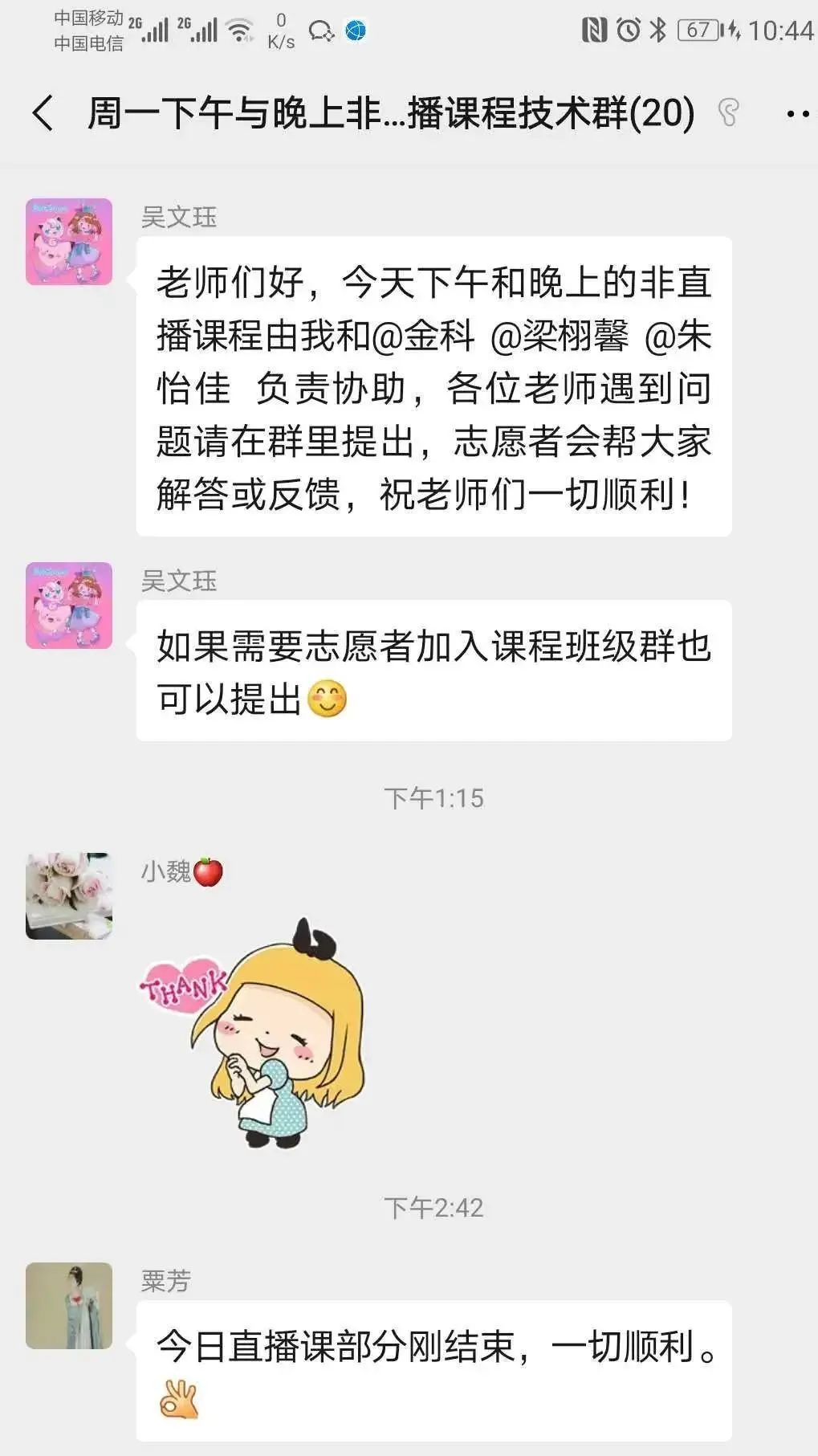 为了确保“教学不间断,课堂不出错”,发挥大学生网络技术特长,学院向学生党员和入党积极分子发出了线上教学技术保障志愿者招募令,得到学生们的积极响应。学生志愿者加入“技术保障群”,通过合理分工,分级建群,服务于不同的课程,在所分配的在线上课时段,一边在线听讲,一边根据“线上课程技术贴士”内容为老师和同学们提供初级的技术支持,完成“发现问题→查表解决→记录&求助→总结改进”的无缝对接,成为网络技术支持的有力补充。