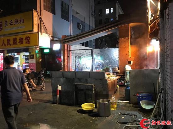 昨晚10时许,记者来到博山路附近。在泾东新村的边门处,记者看到,一名身着背心的摊主支上锅、点着火、倒上油后,便开始麻利地炒菜。只听“嘶啦”一声,一时间,油烟四溢,熏得人睁不开眼。