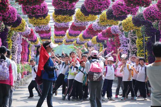 上海(国际)花展上热情洋溢的学生     李凯 摄