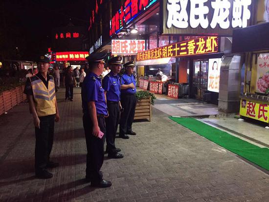 城管塘桥街道中队介绍,针对占道经营行为,中队将派队员和特保辅助队员进行三定管理,即定时、定岗、定责。目前,执法人员每天下午14时起定点管理,在两家小龙虾店门外,固守至次日零时。如发现违法经营行为,立即启动执法程序,对违法行为严格处罚。