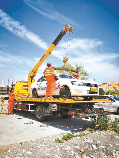 涉案车辆被牵引车拖出“基地”。 (资料)本报讯 (记者 李蕾 通讯员 周光余)昨天上午,市交通委执法总队组织执法力量开展突击检查,取缔了位于浦东新区张杨北路双桥路路口一处“黑”驾培基地,当场查扣涉案车辆19辆。