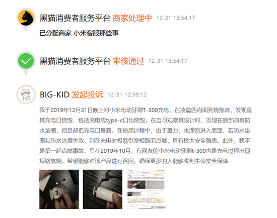 网友投诉:小米电动牙刷t-300充电时燃烧