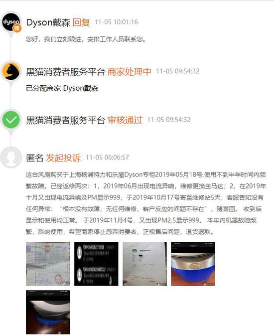 [网友投诉:Dyson无页风扇频繁故障 望商家正视售后问题]网友投诉称,5月18日在上海杨浦特力和乐屋Dyson专柜购买无页风扇,使用不到半年时间频繁故障。6月出现电流异响,维修更换主马达;10月出现电流异响及PM显示999,10月17号寄至维修站5天,客服称没有任何异常:“根本没有故障,无任何维修,客户反应的问题不存在”,遂寄回,收到后显示和使用均正常。 11月4日,又出现PM2.5显示999。 本年内机器故障频繁,影响使用,希望商家正视售后问题,退货退款。截止11月05日10时,@Dyson戴森 在黑猫平台作出回复,称立刻跟进。后续进展,我们将持续关注。投诉详情:https://sh.tousu.sina.com.cn/complaint/view/17348022504/ 黑猫投诉上海站,守护上海人的消费权益,本地投诉入口链接:https://sh.tousu.sina.com.cn/