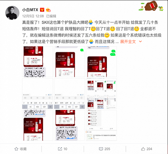 图片来源:新浪微博 图片来源:新浪微博事发后,品牌方回应媒体称,“狂发短信”问题是短信系统故障所导。12月6日下午,SK-II品牌公关经理Mika Ye对界面新闻表示,“品牌一直以来非常重视消费者体验,也致力于为消费者提供更优质的产品与服务。对于此次天猫旗舰店为消费者带来的短信问题,品牌高度重视并深表歉意,目前仍在全力排查中,以免类似事件再次发生。”